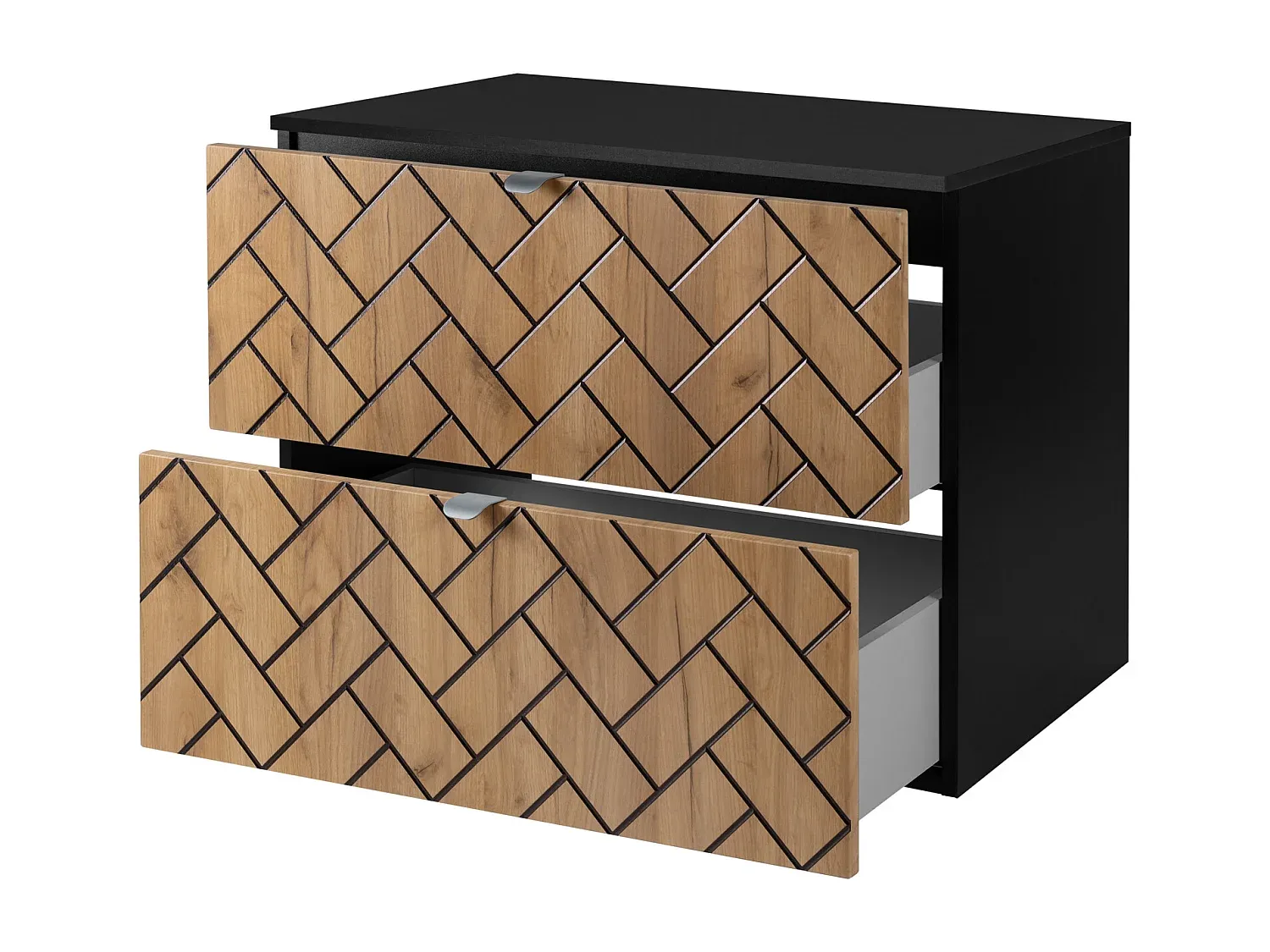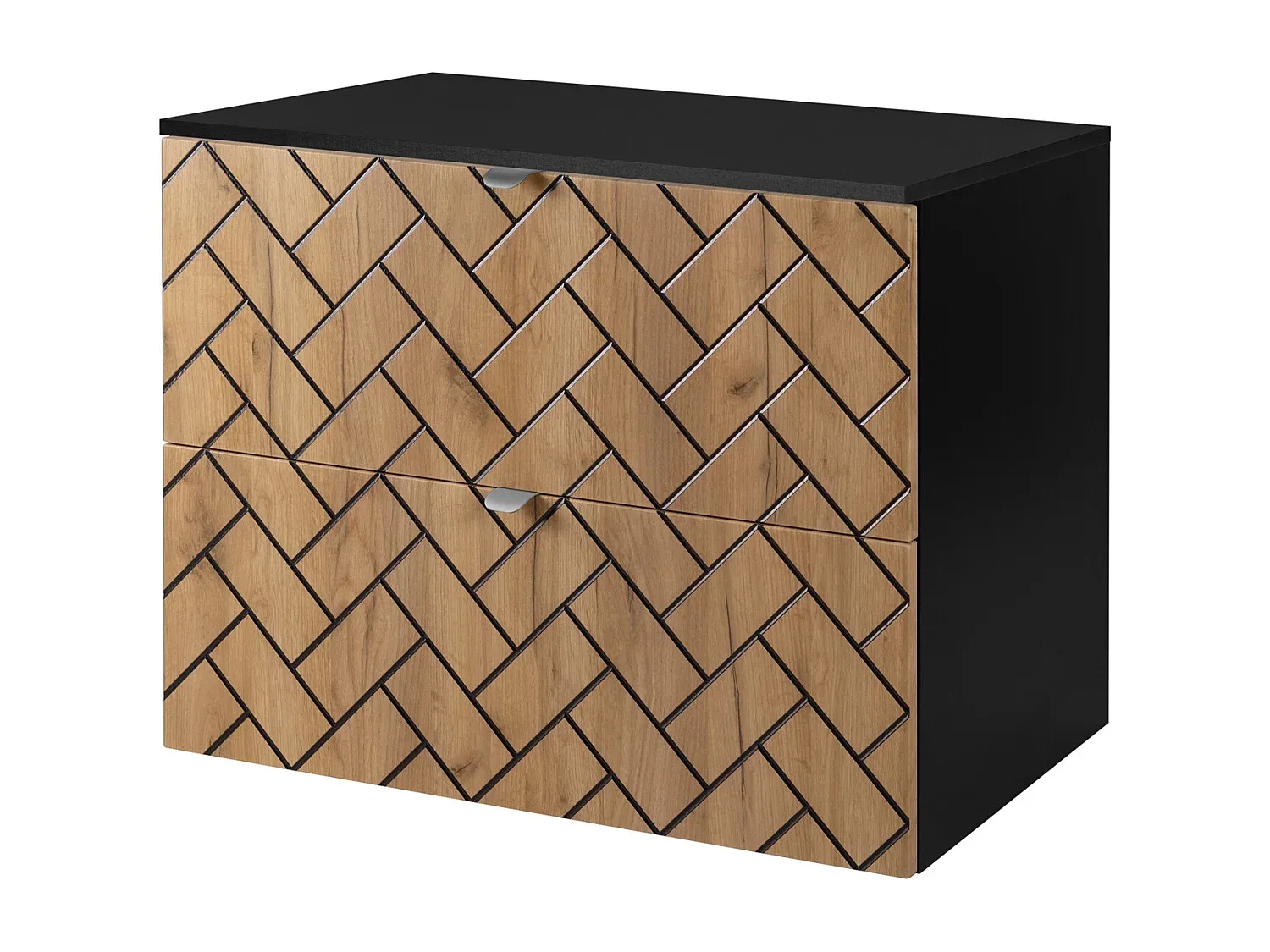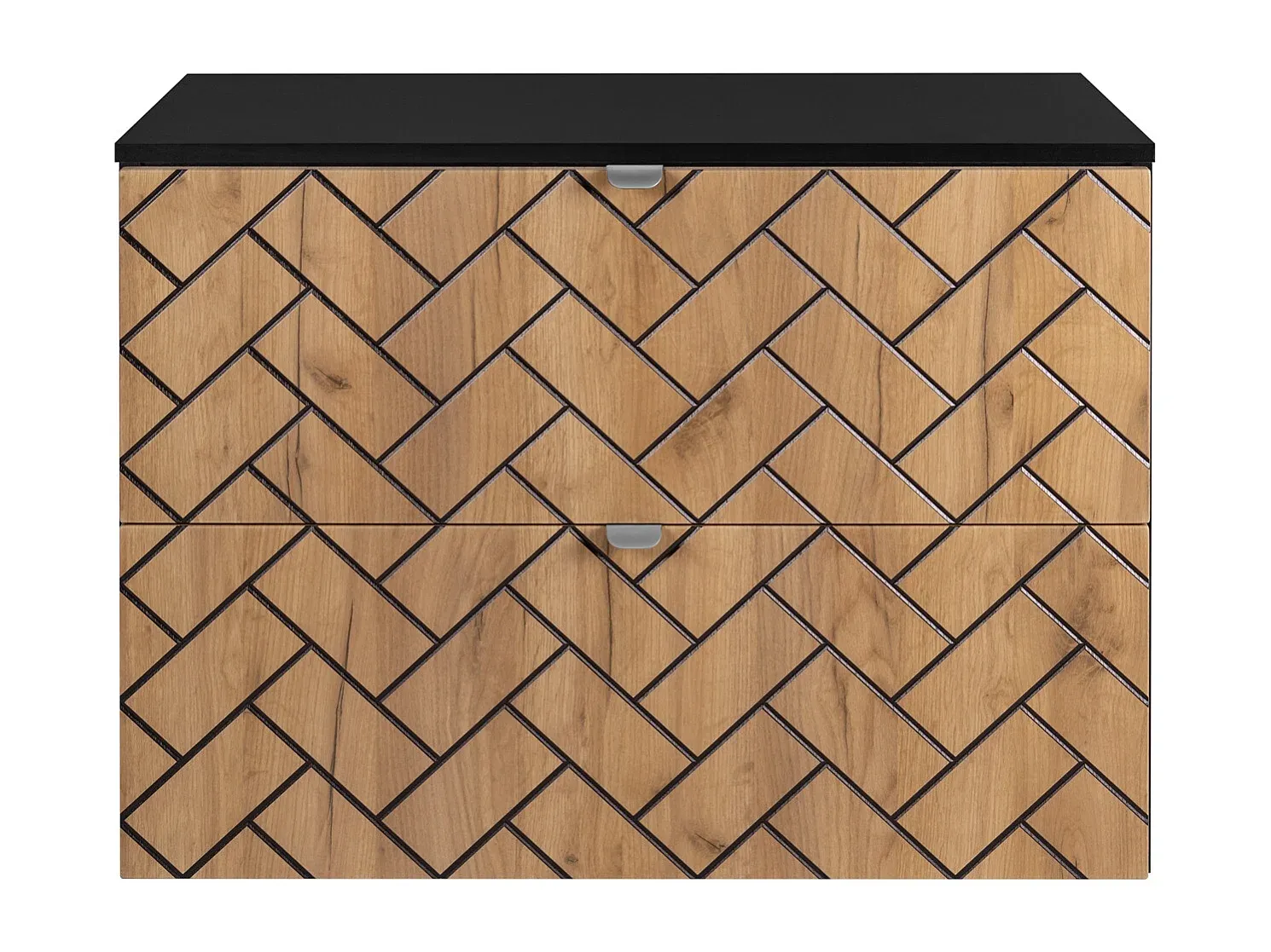 Dieser wandhängende Badezimmerschrank bietet mit seinen zwei Schubladen zusätzlichen Stauraum für Kosmetikartikel und persönliche Handtücher. Die stabile Struktur aus laminierten Platten garantiert Langlebigkeit und ermöglicht eine einfache Selbstmontage. Mit einer Breite von 80 cm, einer Höhe von 57 cm und einer Tiefe von 46 cm eignet sich der Schrank für unterschiedliche Badezimmergrößen. Die Front besteht aus MDF-Platten mit einer Stärke von 16 mm und besitzt silberne Metallgriffe.