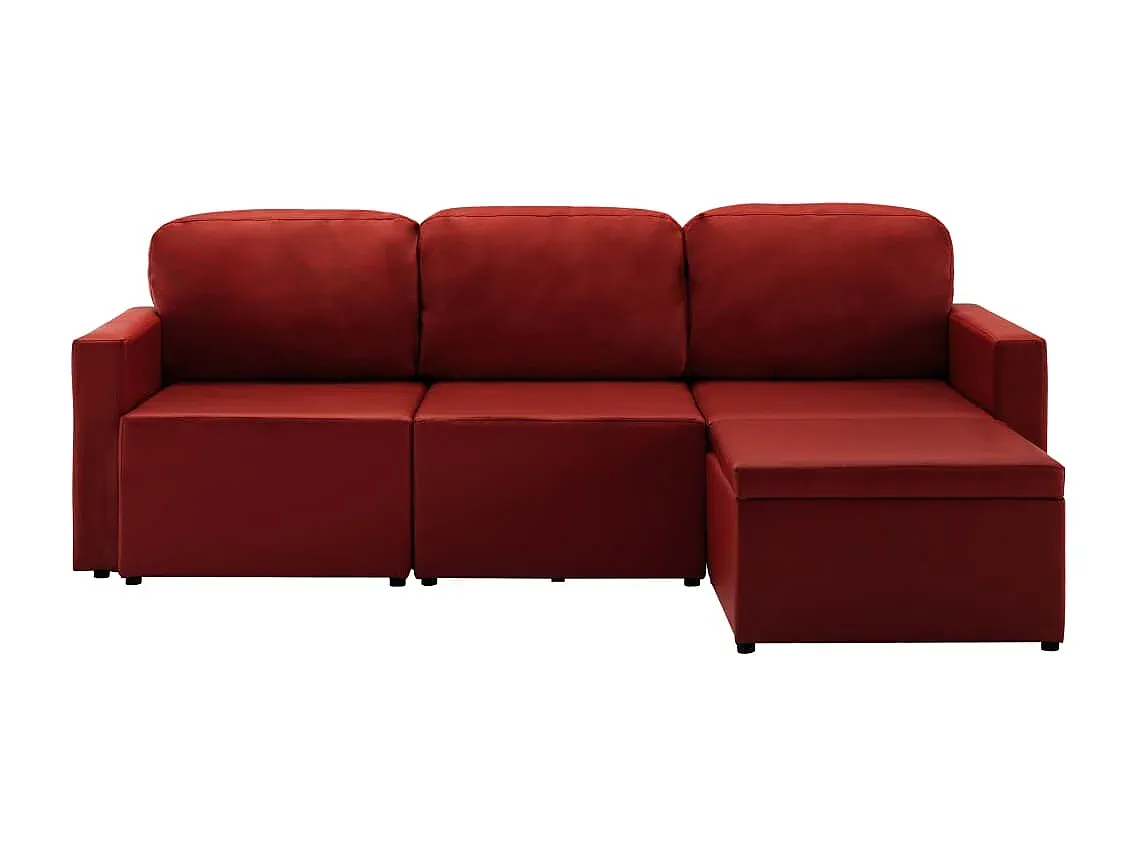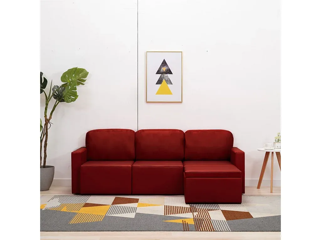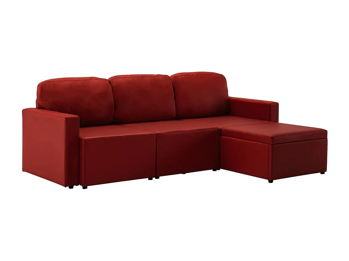 Das modulare 3-Sitzer-Schlafsofa bietet vielseitige Nutzungsmöglichkeiten. Es kann als Couch, Bett, Chaiselongue oder einzelne Stühle und Pouffes konfiguriert werden. Der weiche Kunstlederbezug mit dicker Polsterung ermöglicht eine einfache Pflege. Drei Kissen unterstützen den Sitzkomfort. Das Sofa benötigt eine Montage. Material: Kunstleder, Schaum, Sperrholz, Kiefernholz. Maße: 216 x 149 x 72 cm.
