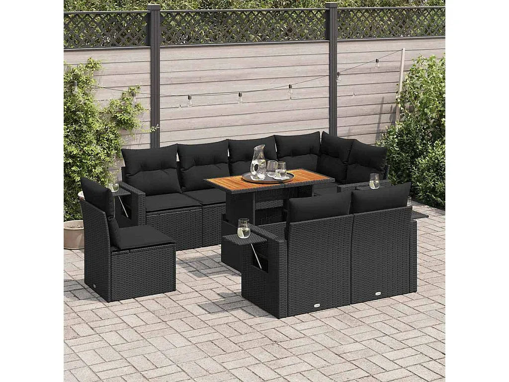 Diese Garten-Sofagarnitur bietet vielseitige Nutzungsmöglichkeiten für den Außenbereich. Hergestellt aus PE-Rattan, zeichnet sie sich durch Widerstandsfähigkeit und einfache Pflege aus. Der integrierte Stauraum unter der Sitzfläche enthält einen wasserfesten Beutel zur Aufbewahrung. Die Tischplatte kann angehoben werden, um den Tisch auf die gewünschte Höhe einzustellen. Sitzkissen sind mit abnehmbaren und waschbaren Bezügen ausgestattet. Das modulare Design ermöglicht flexible Anpassungen der Anordnung.
