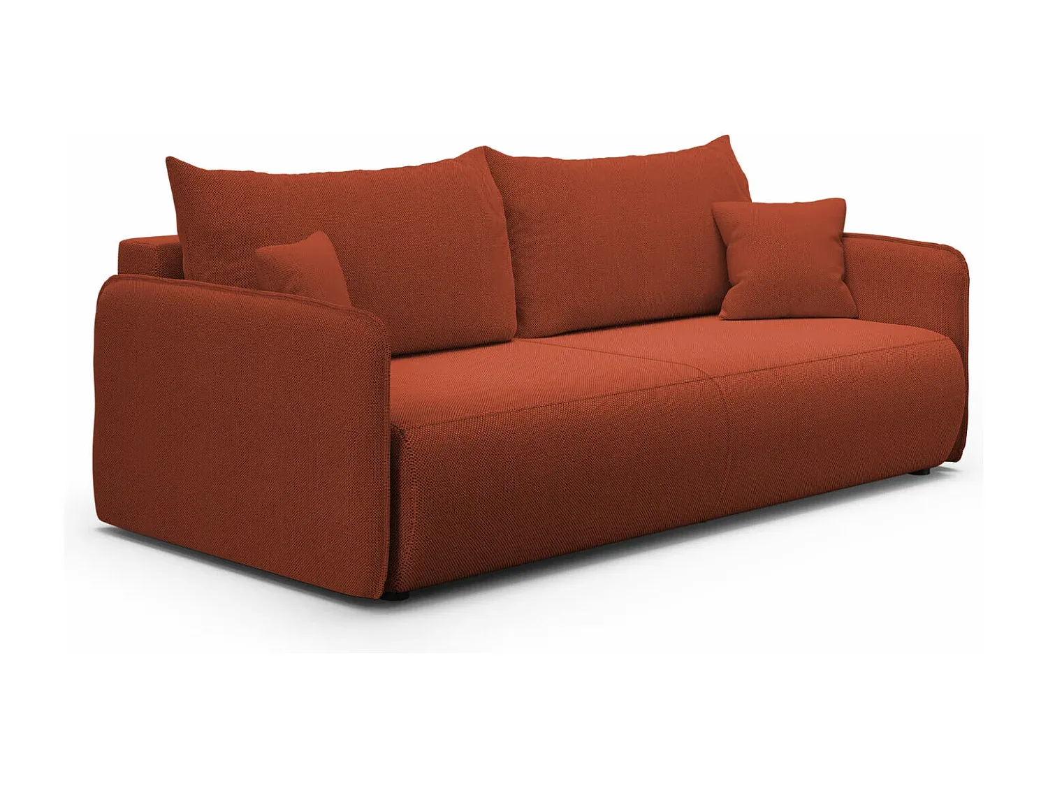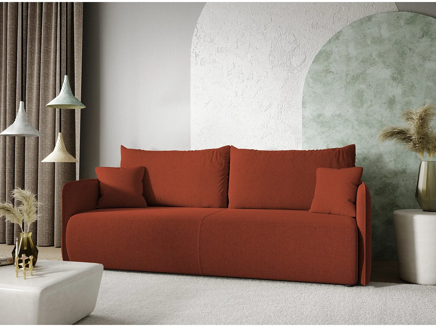 Das Sofa bietet eine Kombination aus Funktionalität und modernem Design. Es ist mit einer Schlaffunktion ausgestattet, die Platz für zwei Personen bietet. Ein integrierter Bettkasten ermöglicht zusätzlichen Stauraum für Bettwäsche. Der wasserabweisende Stoff vereinfacht die Reinigung. Der DL-Mechanismus erleichtert das Ausklappen. Verschiedene Farbvarianten sind erhältlich. Die Rückseite des Sofas ist ebenfalls bezogen, sodass es frei im Raum positioniert werden kann. Die Sitzfläche besteht aus Wellenfedern und Polyurethanschaum. Die Rückenlehne ist ebenfalls aus Polyurethanschaum gefertigt.