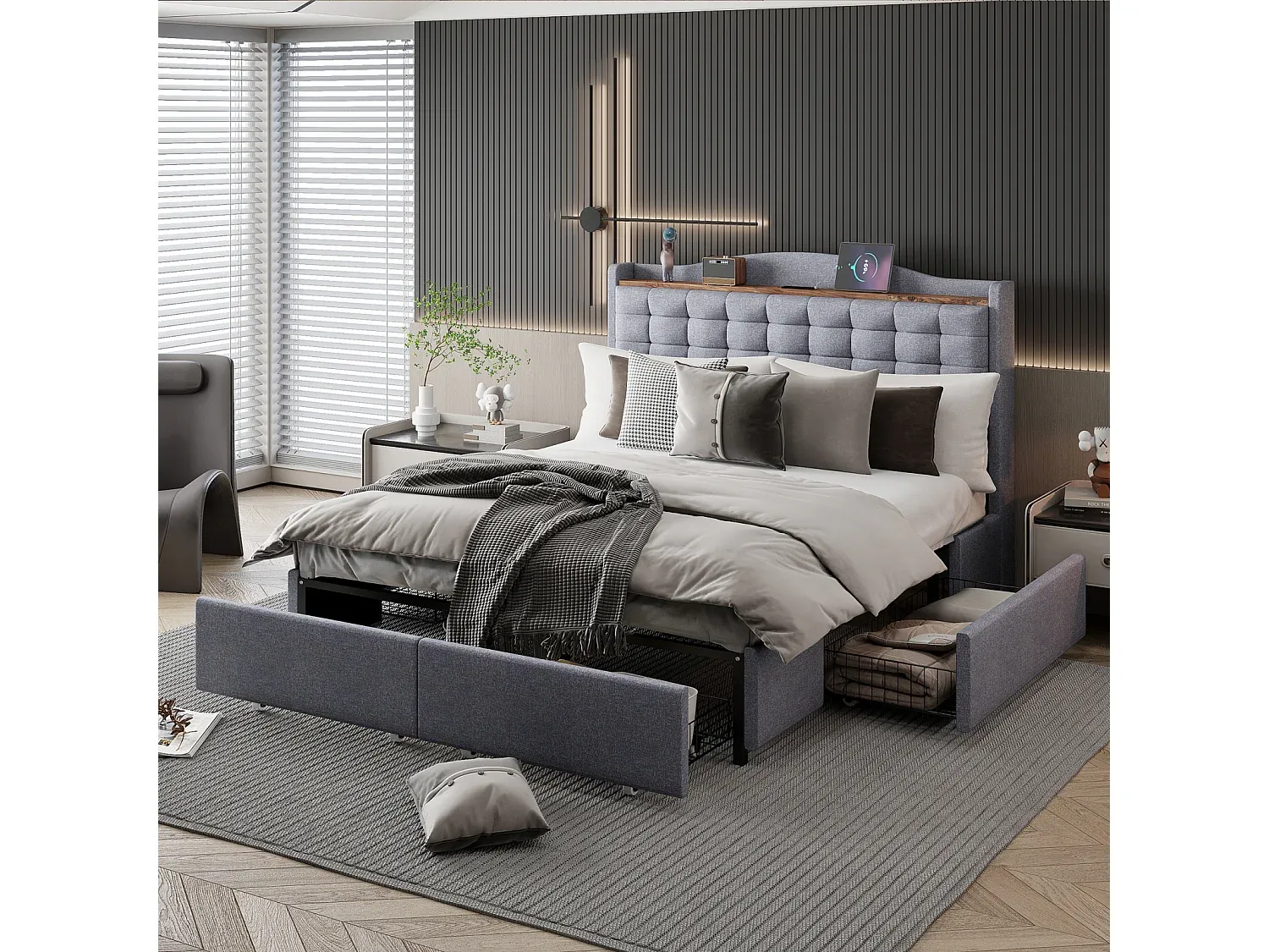 Gepolstertes Doppelbett mit Stauraumfunktion. Ausgestattet mit einem Kopfteil mit USB-Anschluss und Ablageflächen bietet dieses Bett praktische Lösungen für den Alltag. Der Bezug besteht aus Leinenstoff in Grau. Das Bett beinhaltet vier geräumige Schubladen zur Aufbewahrung von Bettwäsche oder Kleidung. Die Konstruktion beinhaltet Holzlatten und Metallkreuzbeine. Geeignet für eine Liegefläche von 140 x 200 cm und bietet Platz für zwei Personen.