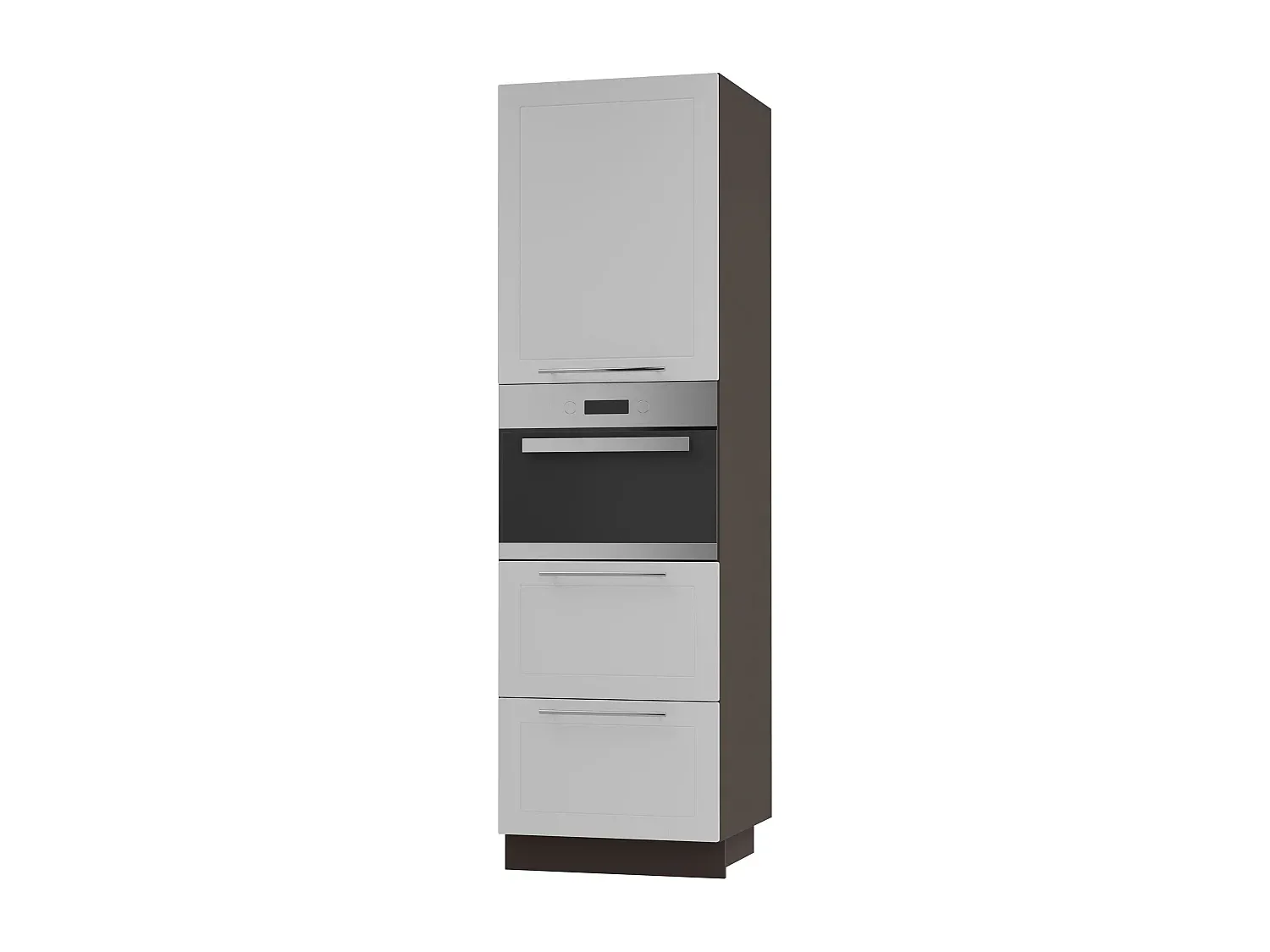 Dieser Küchenhochschrank ist für einen Backofen geeignet und bietet eine Kombination von Funktionen. Er ist mit einer passenden Sockelleiste und regulierbaren Füßen ausgestattet. Die Schubladen sind mit einem Soft-Close-System versehen, das für leises und sanftes Schließen sorgt. Das HETTICH Inno Tech Atira Schubladensystem ermöglicht einen Vollauszug sowie Selbsteinzug. Die Fronten sind individuell justierbar und in verschiedenen Farben erhältlich: weiß matt, grau matt, lava matt, eiche artisan matt und schwarz matt. Die Innenmaße des Gerätefachs betragen B/H 56,8 cm / 59,1 cm. Der Schrank enthält oben eine Tür mit einem festen Boden, eine wechselbare Türanschlagsrichtung und unten zwei Schubladen mit Vollauszug. Die Türscharniere und Metallauszüge sind mit Soft-Close ausgestattet. Der Schrank besitzt Fronten mit Fräsungen und abgerundeten Ecken sowie Griffe aus Chrom. Die Füße sind in der Höhe regulierbar. Die Konstruktion besteht aus faserverstärkten Platten und MDF mit pflegeleichten Oberflächen.