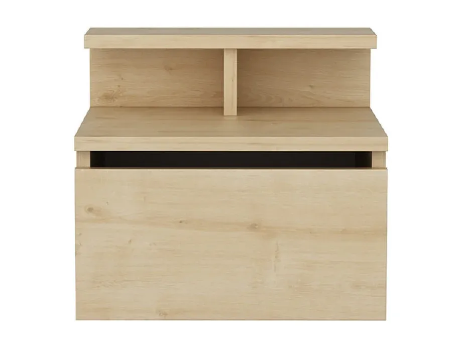 Dieser wandmontierte Nachttisch bietet eine praktische Aufbewahrungslösung mit einer Schublade und einem zusätzlichen Regal. Die Hauptmerkmale umfassen eine Oberflächenausführung in Holzoptik, hauptsächlich aus Spanplatten mit melaminbeschichteter Oberfläche. Die Abmessungen betragen 39,8 x 31,9 x 35 cm.