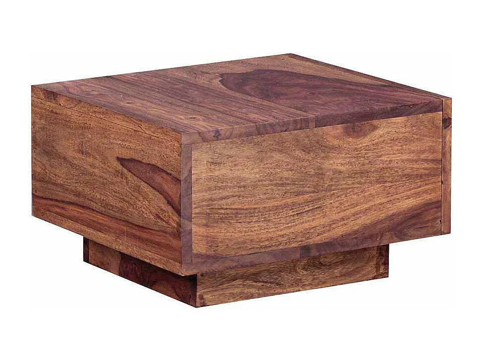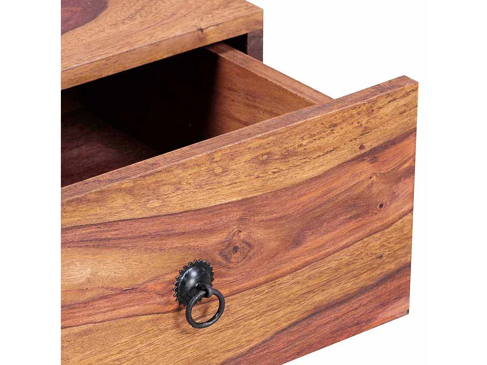 Nachttisch aus Sheesham Massivholz mit Metallgriffen. Die Oberfläche ist lackiert. Der Tisch zeigt sich im Landhausstil und besitzt ein Sockelgestell aus Holz. Der Schlaftisch verfügt über eine Schublade mit Holzauszug und hat eine quadratische Form. Er ist in Sheeshamfarben gehalten.