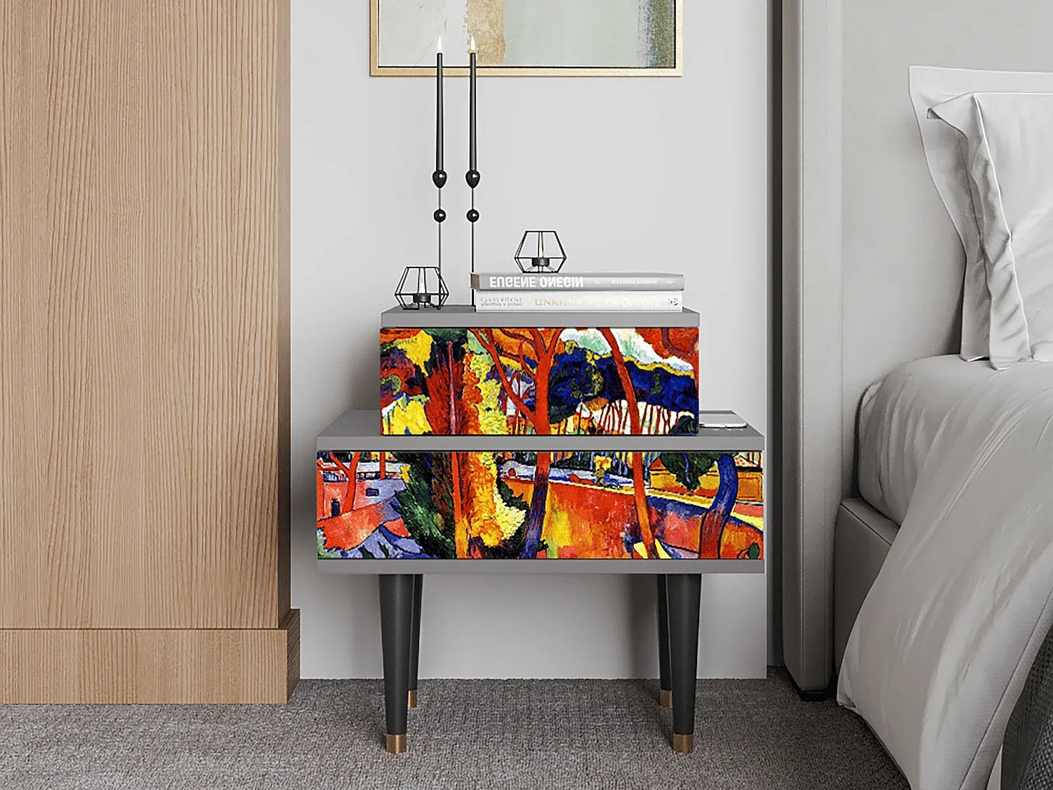 Ein vielseitiges Möbelstück, das sich für verschiedene Zwecke eignet. Es bietet Platz für Gegenstände wie Vinylplatten oder kann als Nachttisch genutzt werden. Die Fronten sind präzise gefertigt und mit UV-Druck versehen, um dem Design Tiefe zu verleihen. Die Oberfläche ist lackiert, was für Langlebigkeit sorgt. Mit stabilen Holzbeinen und Metallelementen passt es in verschiedene Einrichtungsstile und fügt sich harmonisch in den Raum ein. Maße: Breite: 58 cm, Höhe: 58 cm, Tiefe: 48 cm.