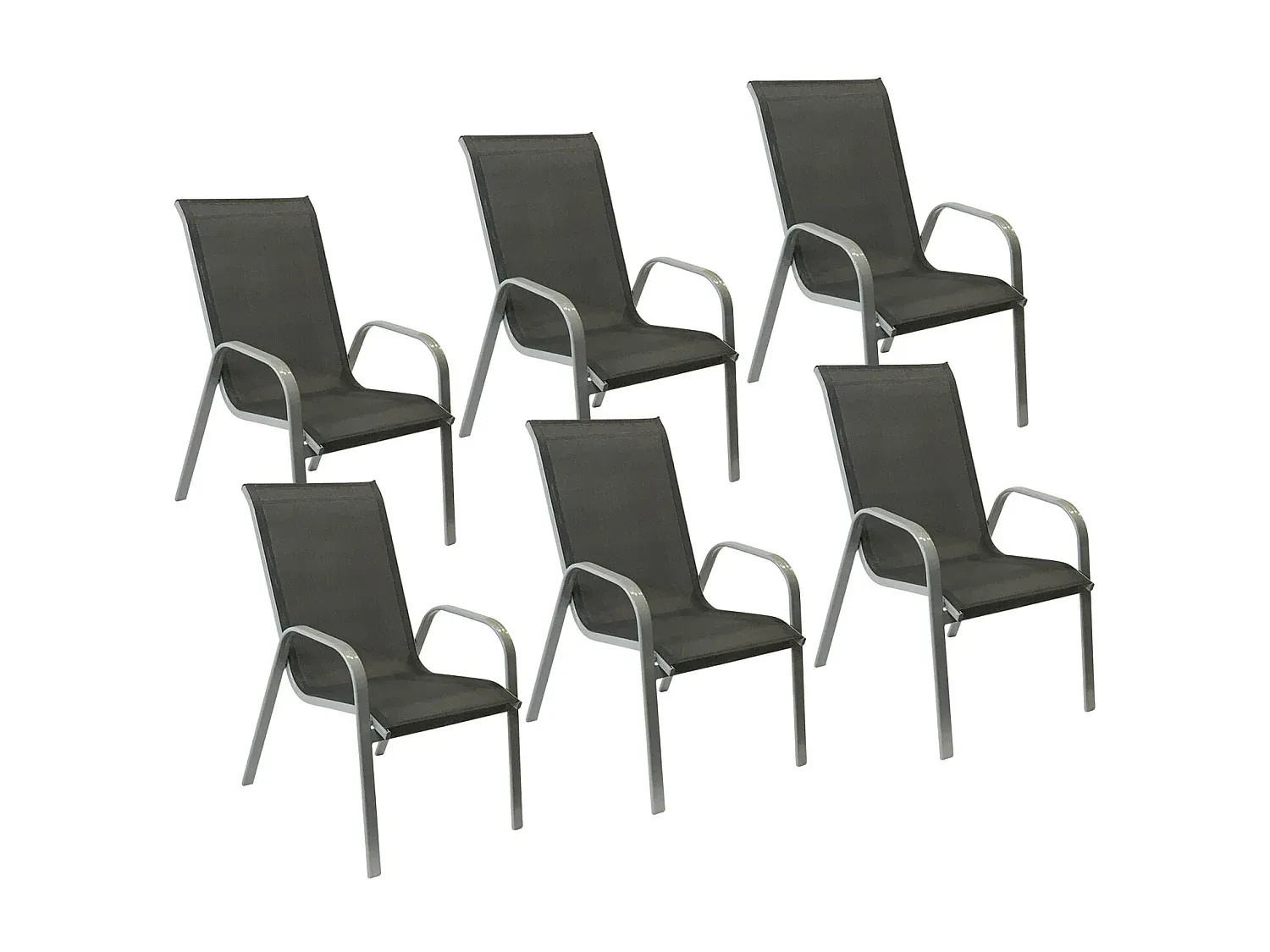 Diese Stühle bieten ein modernes Design für den Außenbereich. Die Sitzflächen bestehen aus Textilene und sind mit Aluminium- und Stahlkomponenten ausgestattet. Farbe ist Grau. Die Stühle sind wasserfest und UV-beständig. Maße: Breite 56,5 cm, Höhe 94,5 cm, Tiefe 76 cm, Sitzhöhe 43 cm, Armlehnenhöhe 60,5 cm.