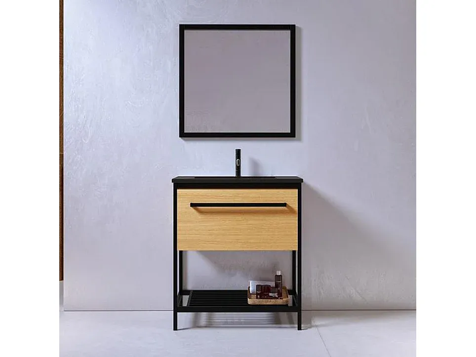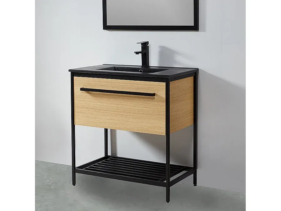 Badmöbel aus Metall, Holz und Keramik. Diese Kombination bietet Funktionalität und Haltbarkeit und verleiht Ihrem Badezimmer einen modernen und industriellen Touch. Das Set enthält: ein einzelnes Keramikbecken in Schwarz, einen niedrigen Schrank auf Metallbeinen mit einer Schublade. Die Verbindung von Holz und Metall präsentiert sich in zeitgemäßen Linien. Details: Metallstruktur, Keramikwaschbecken mit Überlaufsystem, Schublade mit Soft-Close-Mechanismus, Holzfaserplatte, Stauraum für Produkte oder Badwäsche, höhenverstellbare Füße, Breite: 81 cm, Tiefe: 47 cm. Besonderheiten: Becken mit vorgebohrtem Loch für die Armatur, Ablaufventil und Siphon nicht enthalten, weiteres Zubehör separat erhältlich.