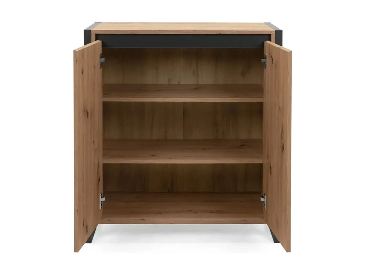 Dieser Beistellschrank bietet Stauraum zum Aufbewahren verschiedener Gegenstände. Er hat einen industriellen Stil mit heller Farbe und Anthrazit-Akzenten. Der Schrank verfügt über zwei Türen, drei geschlossene Fächer und zwei Einlegeböden. Die Beine sorgen für Stabilität. Hinweis: Mit einem feuchten Tuch abwischen. Farbe: Artisan-Eiche und Anthrazit Material: Spanplatte und MDF Abmessungen: 80 x 40 x 88 cm (B x T x H)