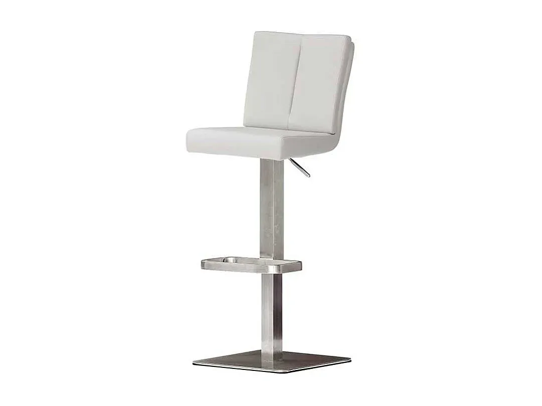 Höhenverstellbarer Barhocker in Weiß mit Lehne. Der Hocker ist drehbar und lässt sich durch Gasdruck anpassen. Ausgestattet mit einem Tellerfuß und einem Bezug aus Kunstleder (100 % Polyurethan). Der Hocker besteht aus Kunstleder und Edelstahl. Die Sitztiefe beträgt 38 cm und die Sitzhöhe 81 cm. Der Barhocker misst 41 cm in der Breite, 117 cm in der Höhe und 53 cm in der Tiefe.