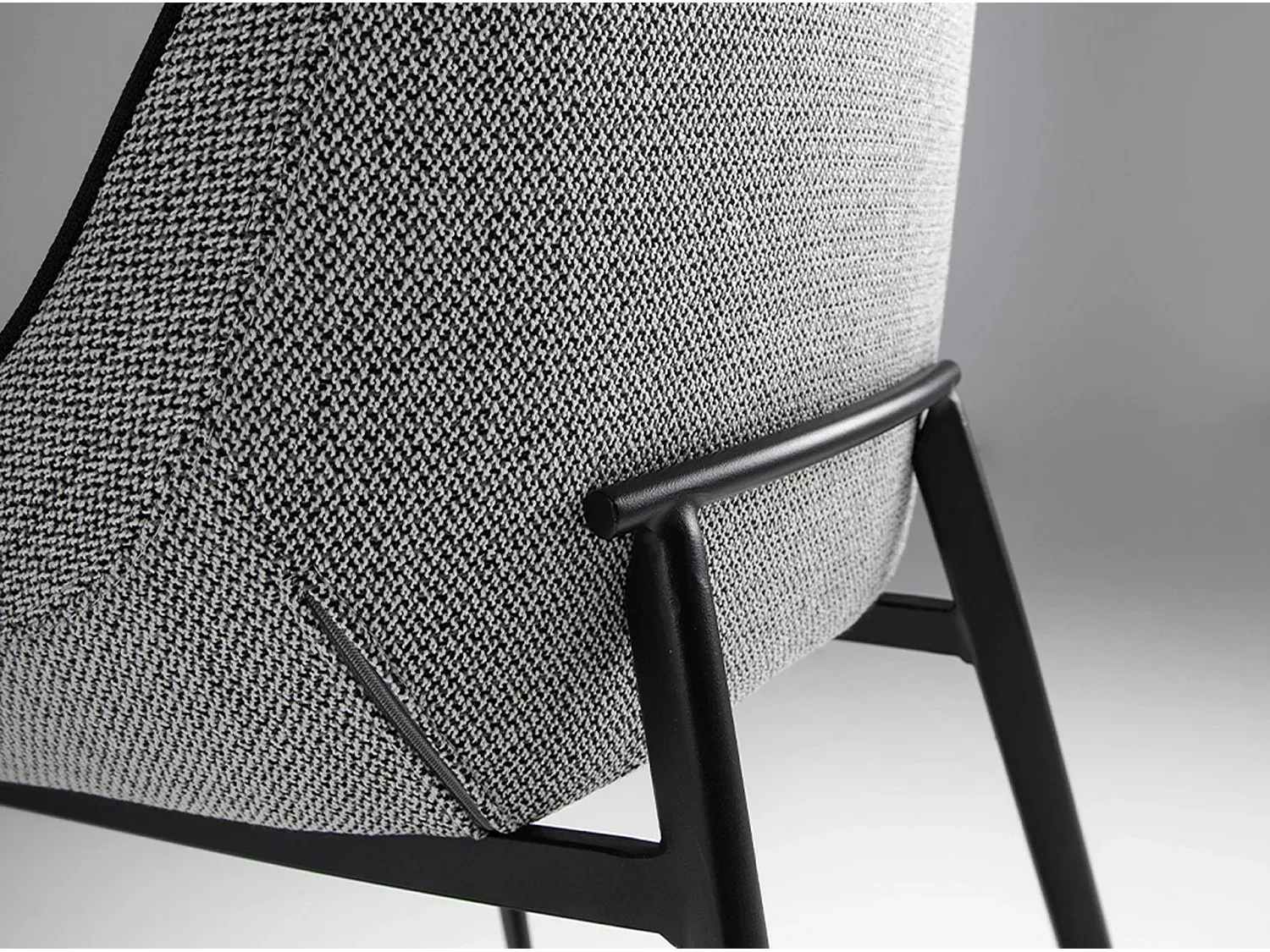 Stuhl mit Sitz und Rückenlehne aus grauem Stoff. Die schwarzen Edelstahlbeine verleihen ihm einen modernen Stil für Küche oder Esszimmer. Die Polsterung und die Struktur der Beine bieten Komfort und Stabilität.