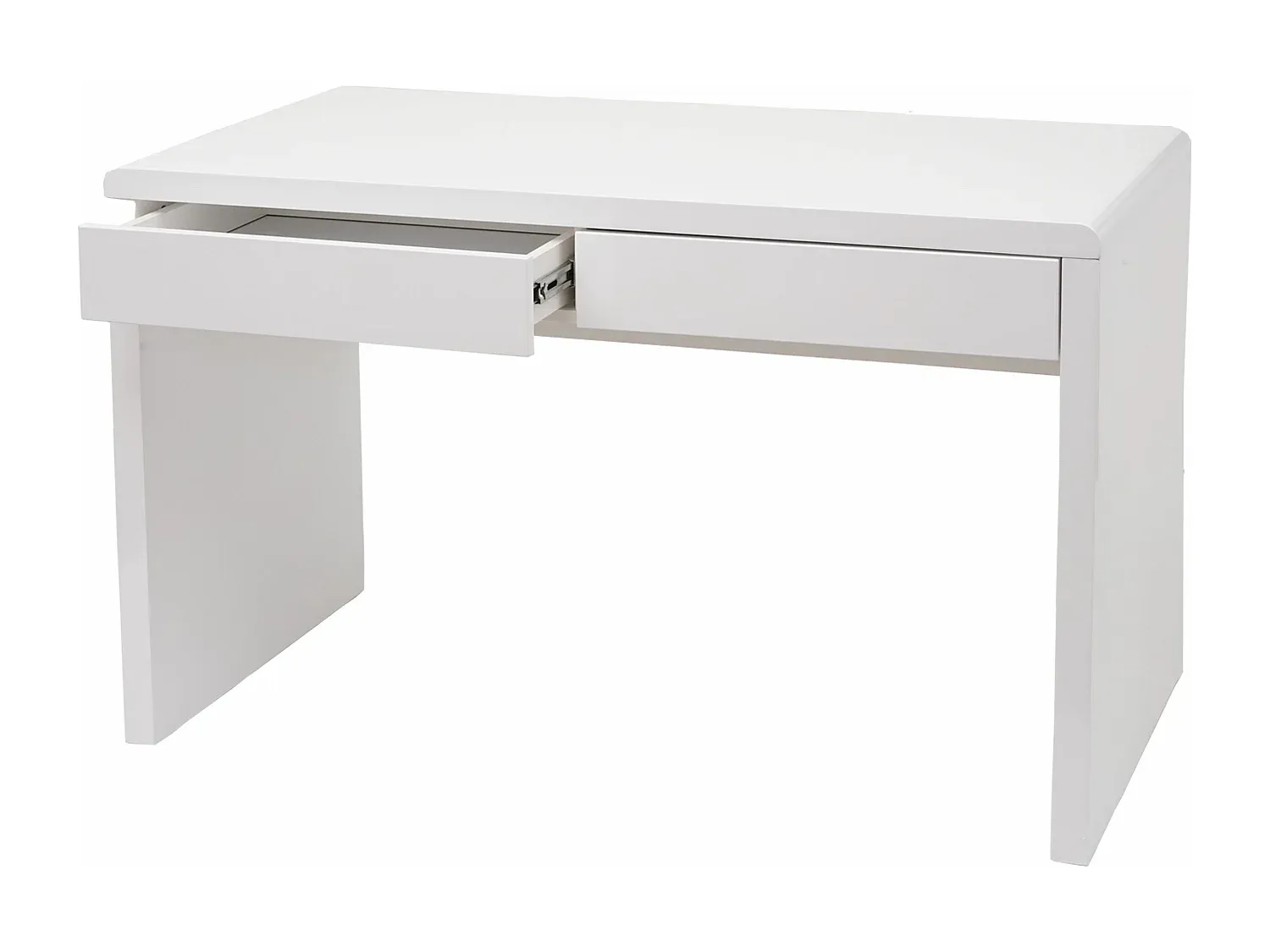 Dieser Schminktisch bietet zwei Schubladen für die Aufbewahrung von Kosmetika und Accessoires. Er zeichnet sich durch abgerundete Kanten aus und ist funktional gestaltet. Die Tischplatte und Beine sind hochglanzlackiert. Erhältlich in zwei Größen: 100x60 cm und 120x60 cm. Die Schubladen bieten ausreichend Stauraum für den täglichen Gebrauch.