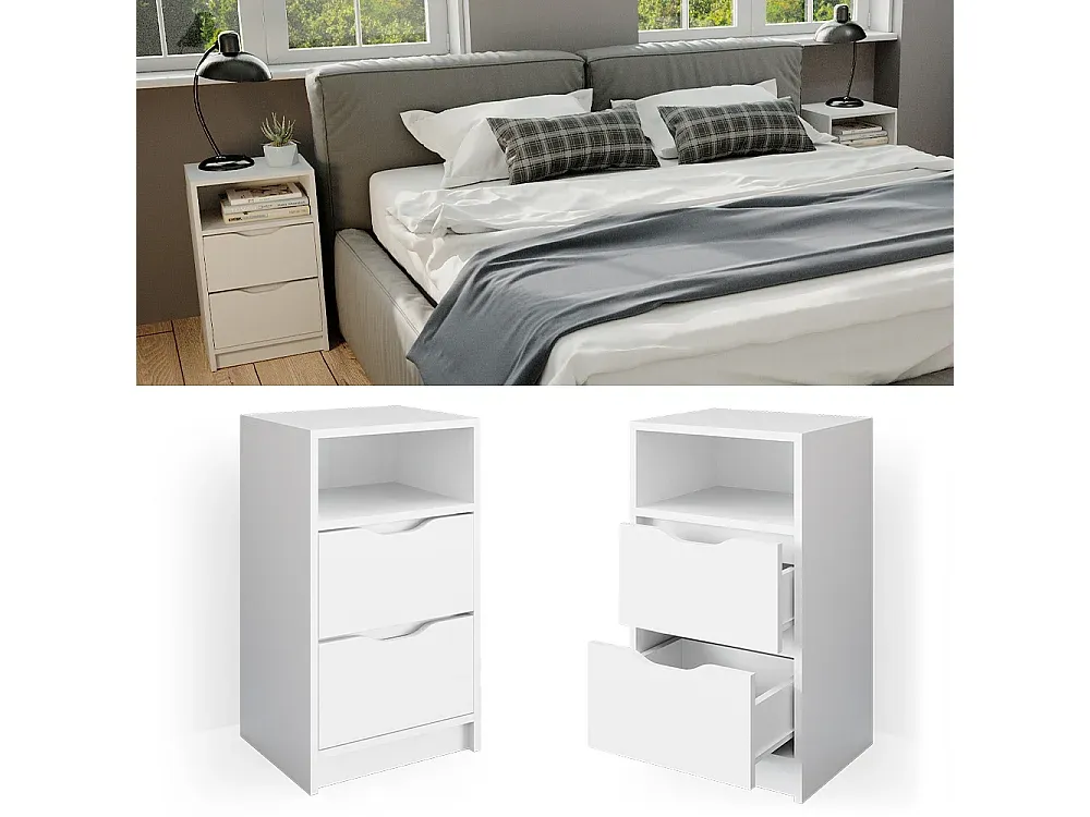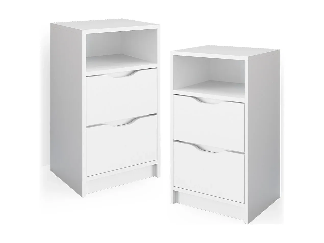 Das Nachttisch-Set bietet eine praktische Aufbewahrungsmöglichkeit für persönliche Dinge. Ein minimalistisches Design mit grifflosen Fronten und einem offenen Regal schafft ein modernes Flair im Schlafzimmer. Die zwei Schubladen sind ideal für Utensilien, die Sie in Bettnähe aufbewahren möchten. Verschiedene Verwendungsmöglichkeiten als Nachtkommode, Nachttischschrank oder Beistelltisch sind gegeben.