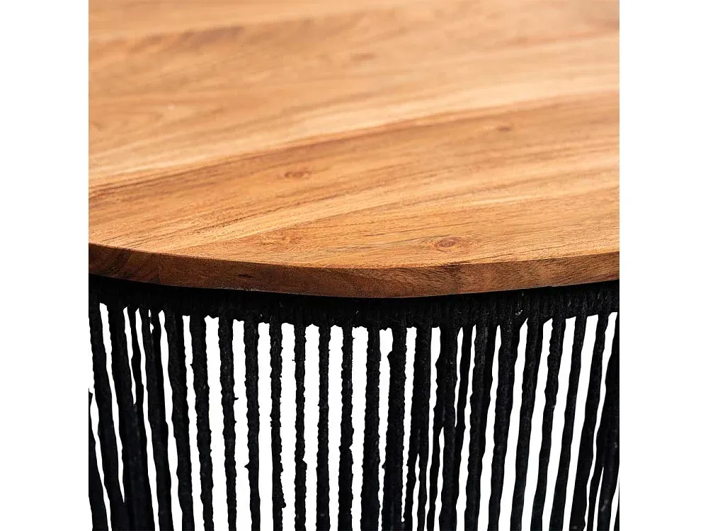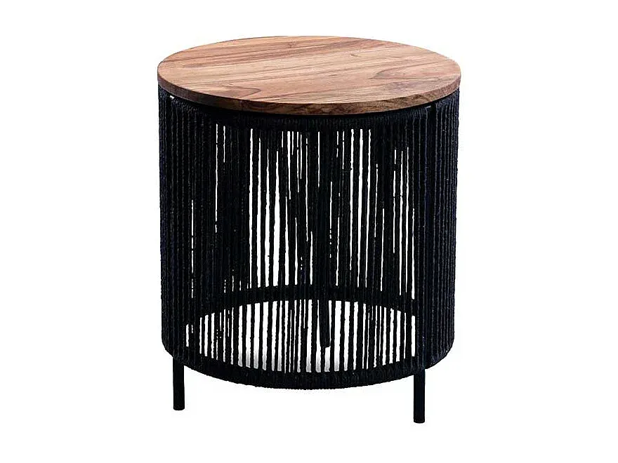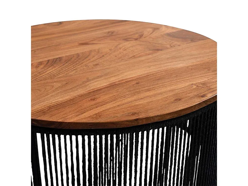 Wohnzimmertisch Beistelltisch aus Kordel mit Massivholzplatte. Tisch mit modernem Design aus Holz in runder Form. Tisch in Akaziefarben und Schwarz mit Dreifußgestell und Geflecht Oberfläche. Wohnzimmer Tisch aus Akazie Massivholz, Metall und Kordel. Maße: 40 cm Breite, 45 cm Höhe, 40 cm Tiefe.