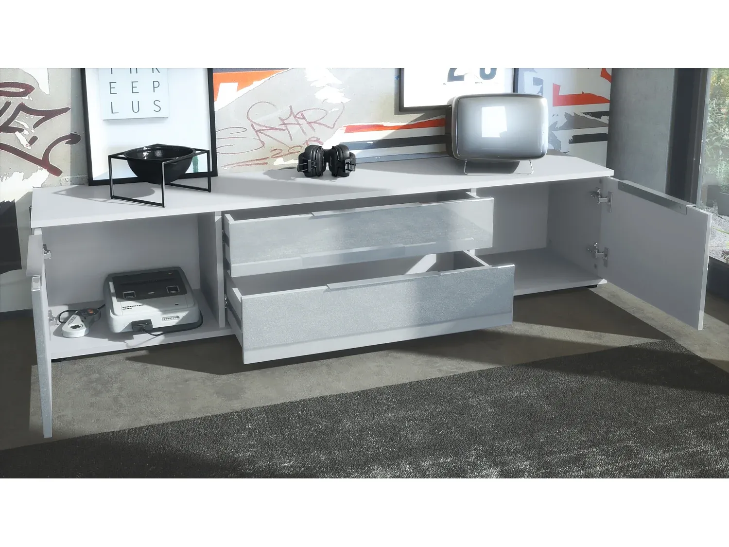 Dieser Fernsehschrank bietet zwei geräumige Schubladen und zwei Türen mit jeweils einem Fach, geeignet für verschiedene Mediengeräte. Es verfügt über silbergraue Winkelgriffe und Schubladen, die auf Metall-Teleskopschienen laufen. Der Korpus ist in mattem Weiß, die Türen in Weiß Hochglanz und die Schubladen in Grau Hochglanz gestaltet. Hergestellt aus foliertem MDF und melaminbeschichteten Spanplatten bietet es Stabilität und einfache Pflege. Das Möbelstück ist benutzerfreundlich im Aufbau und bietet vielseitigen Stauraum. Die Türen und Schubladen ermöglichen es, Gegenstände ordentlich zu verstauen. Die Abmessungen betragen (Bx Hx T): 166,5 x 37,5 x 35 cm.