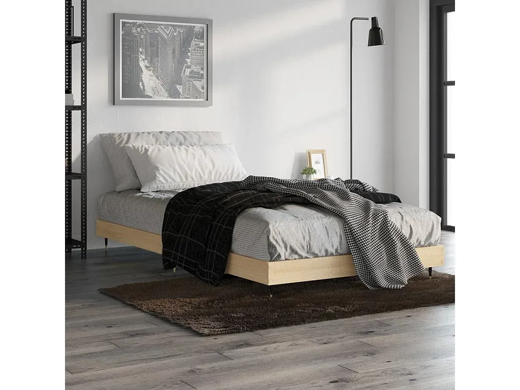 Dieses Bett bietet eine geeignete Lösung für das Schlafzimmer. Das Material besteht aus Holzwerkstoff, das für seine Festigkeit und Feuchtigkeitsbeständigkeit bekannt ist. Die Metallbeine gewährleisten Stabilität und Sicherheit. Die Sperrholzlatten sorgen für eine gleichmäßige Gewichtsverteilung und halten die Matratze an Ort und Stelle. Das Bett erfordert Montageschritte. Farbe: Sonoma-Eiche. Material: Holzwerkstoff und Metall. Lattenmaterial: Sperrholz. Abmessungen: 203 x 93 x 20 cm (L x B x H). Geeignet für Matratzengröße: 90 x 200 cm.