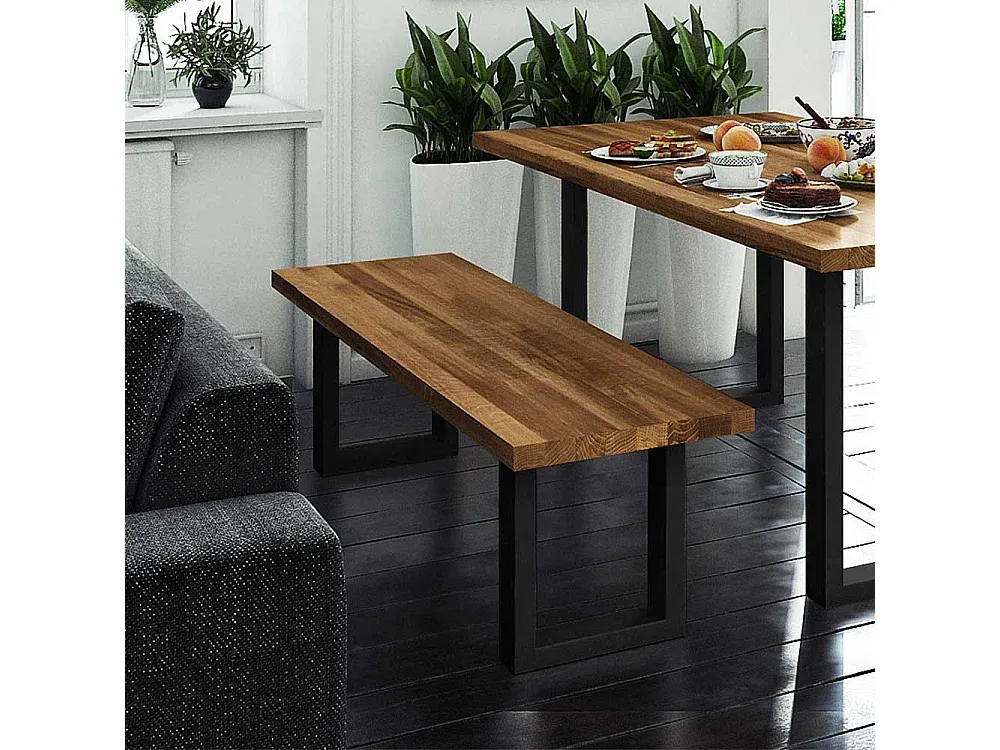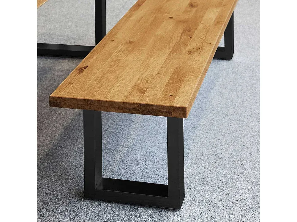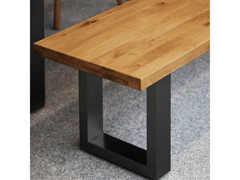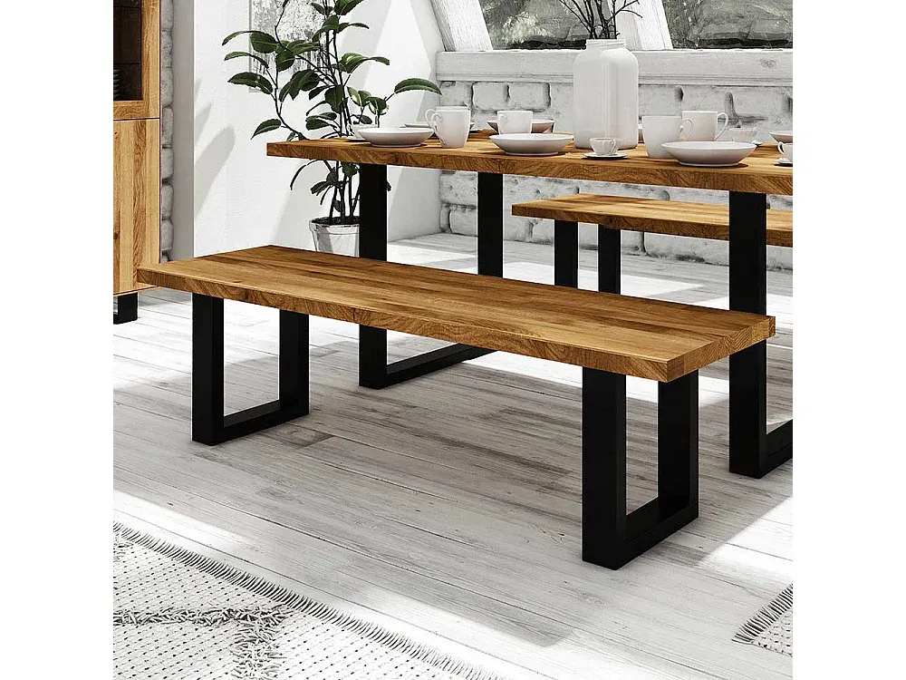 Esszimmerbank aus Wildeiche und Stahl mit geölter Oberfläche. Moderne rechteckige Form mit Metall-Bügelgestell. Erhältlich in verschiedenen Breiten mit 2 bis 4 Sitzplätzen. Sitzhöhe: 45 cm. Sitztiefe: 45 cm. Maße: Breite wählbar von 140 cm bis 200 cm.