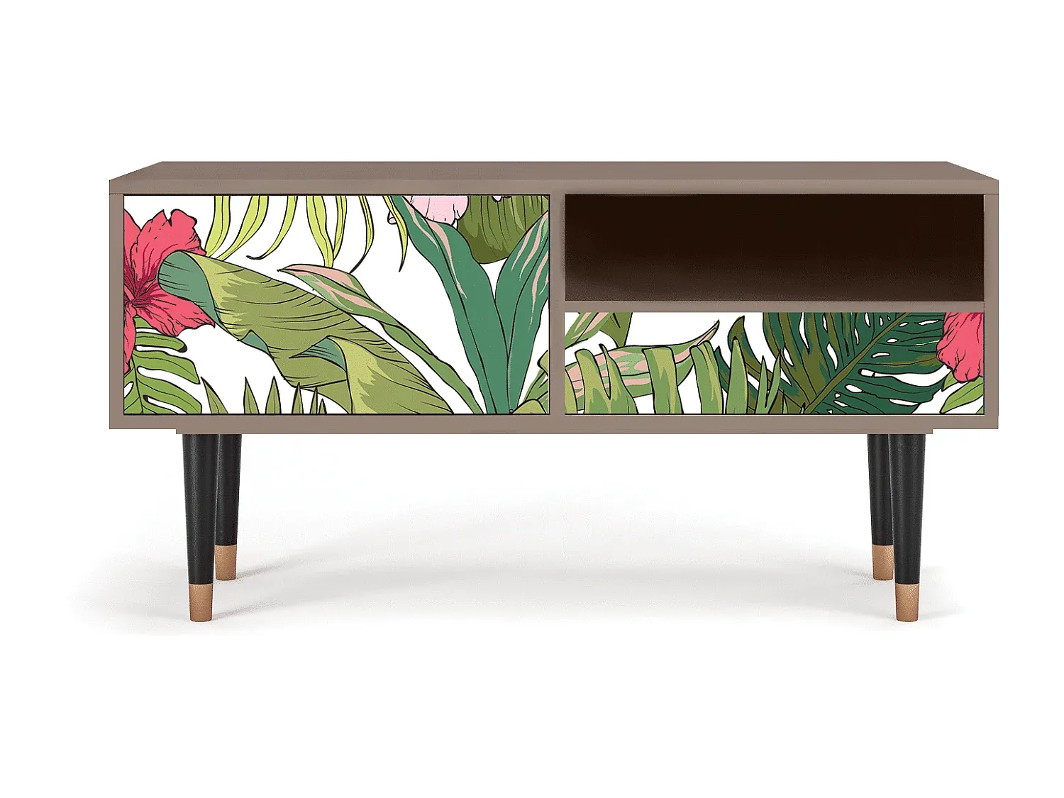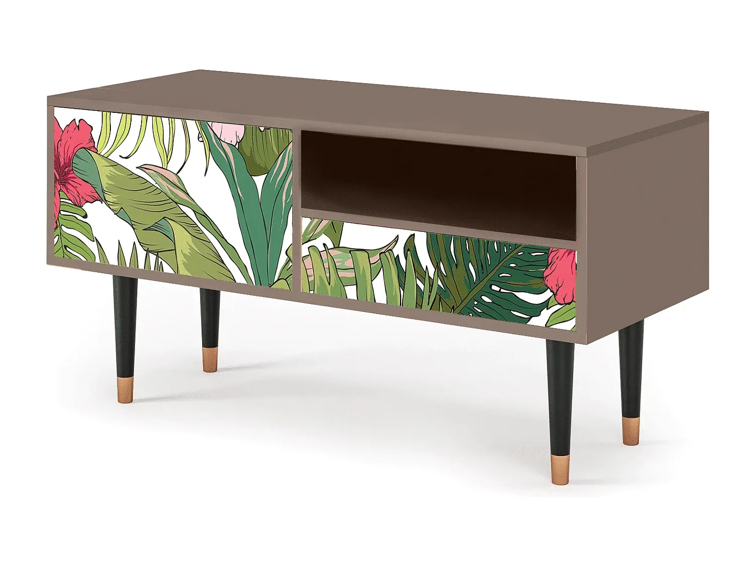 Dieses Möbelstück ist funktional für kleinere Räume. Es bietet clevere Stauraumlösungen und passt in verschiedene Einrichtungsstile. Die Fronten sind präzise gefertigt und mit UV-Druck versehen. Die Oberfläche ist lackiert, um Kratzern und Verblassen vorzubeugen. Es steht auf stabilen Holzbeinen mit Metallelementen. Die Maße sind Breite: 115 cm, Höhe: 59 cm, Tiefe: 48 cm.