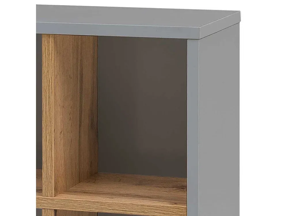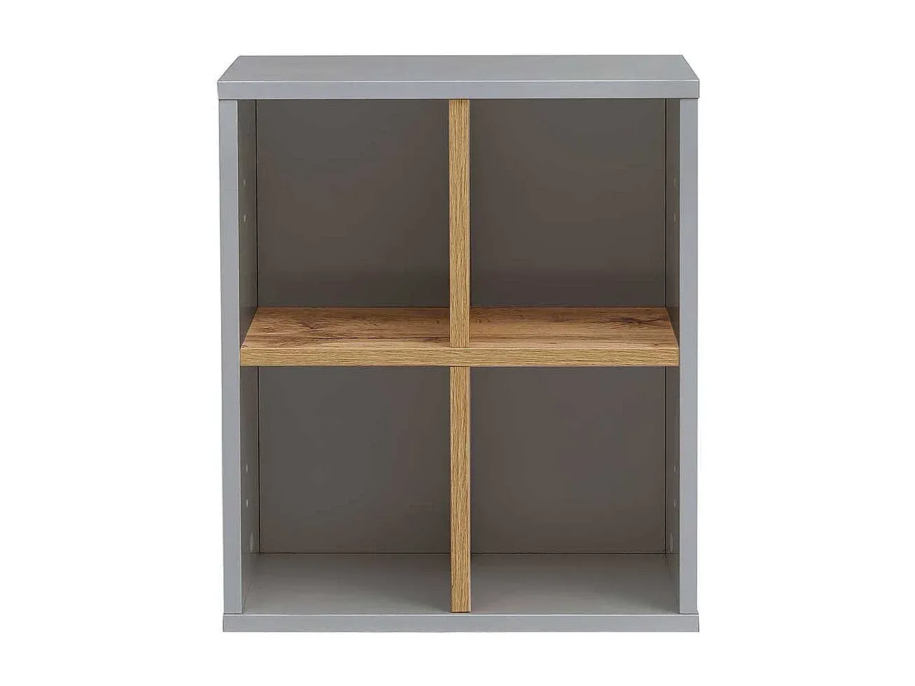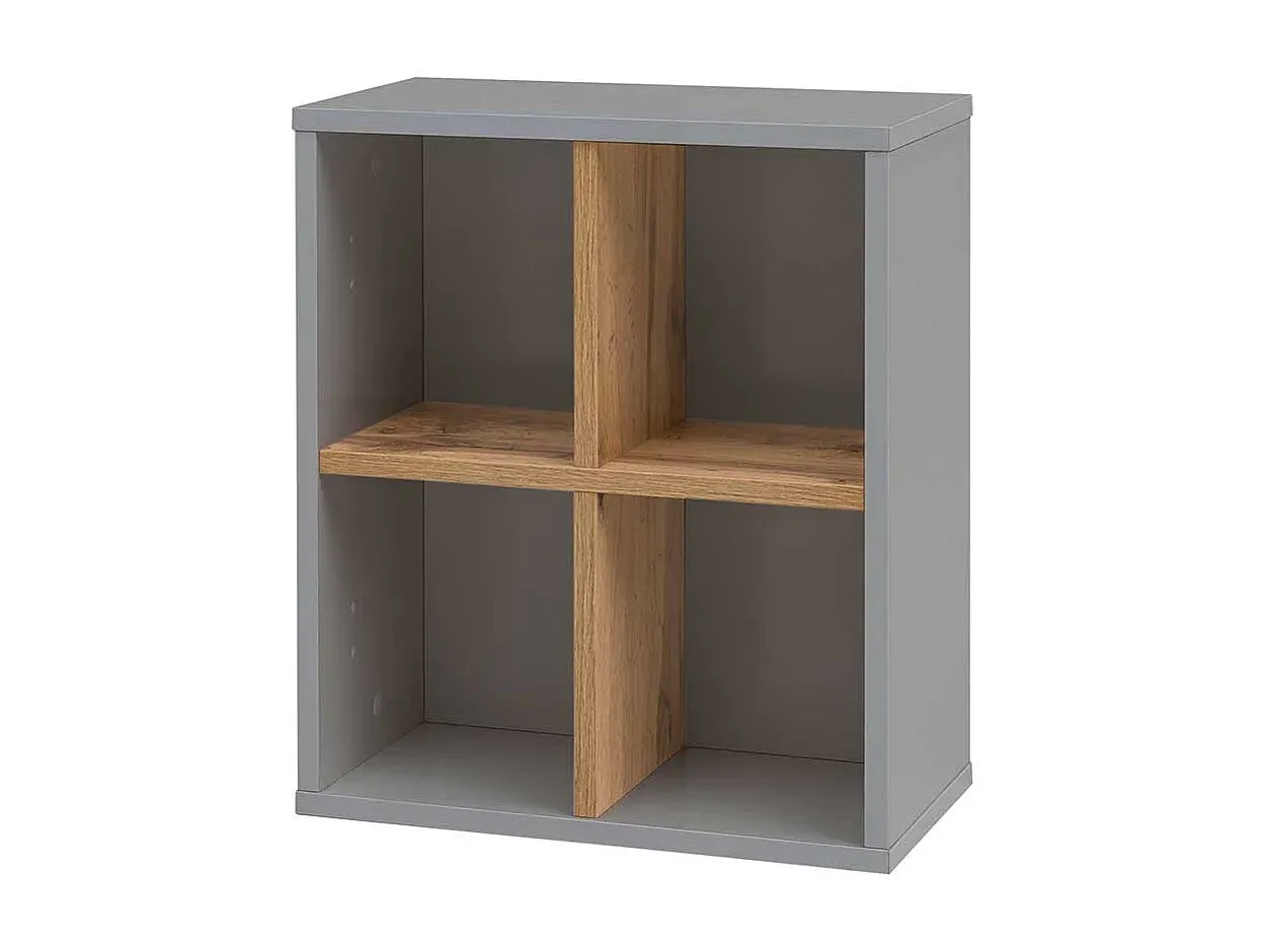 Wandregal in rechteckiger Form mit vier Fächern. Hergestellt aus melaminbeschichteter Spanplatte. Erhältlich in Platingrau und Eichenfarben. Maße: 41 cm breit, 48 cm hoch, 21 cm tief. In Landhausstil.
